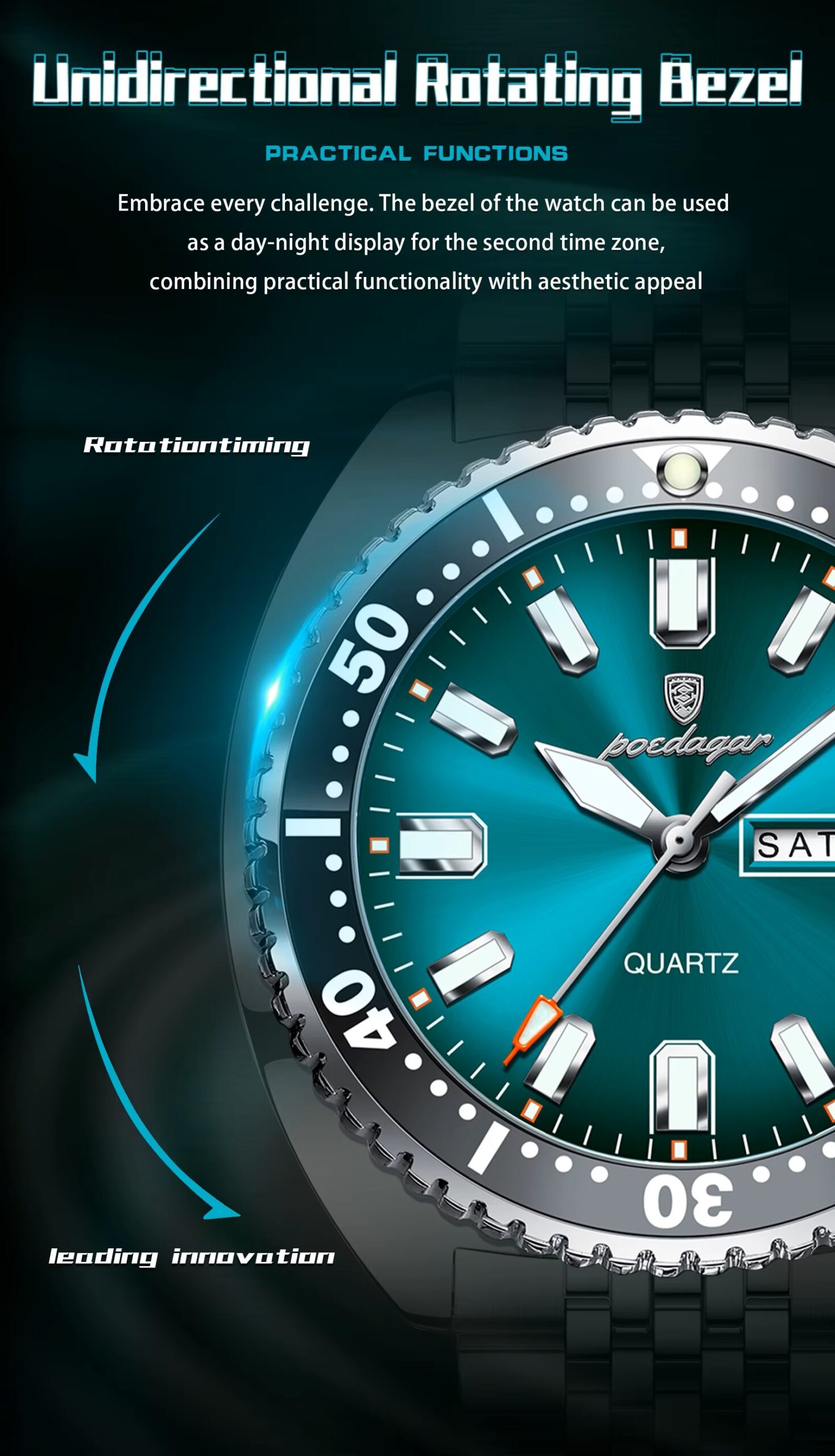 Original Top Luxury POEDAGAR Stainless Steel Quartz Watch, Dual Calender Date Week, Luminous Hands Clock, 3ATM Deep Waterproof Watch
